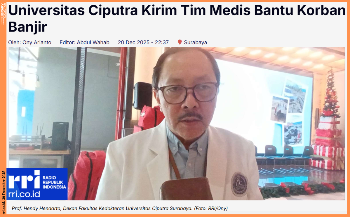 KBRN, Surabaya: Kampus Universitas Ciputra Surabaya ikut tergerak untuk membantu korban banjir bandang di Agam Sumatera Barat. Hendy Hendarto, Dekan Fakultas Kedokteran Universitas Ciputra Surabaya, Sabtu (20/12/2025), menyebut pihak kampus mengirim tim medis ke daerah bencana.