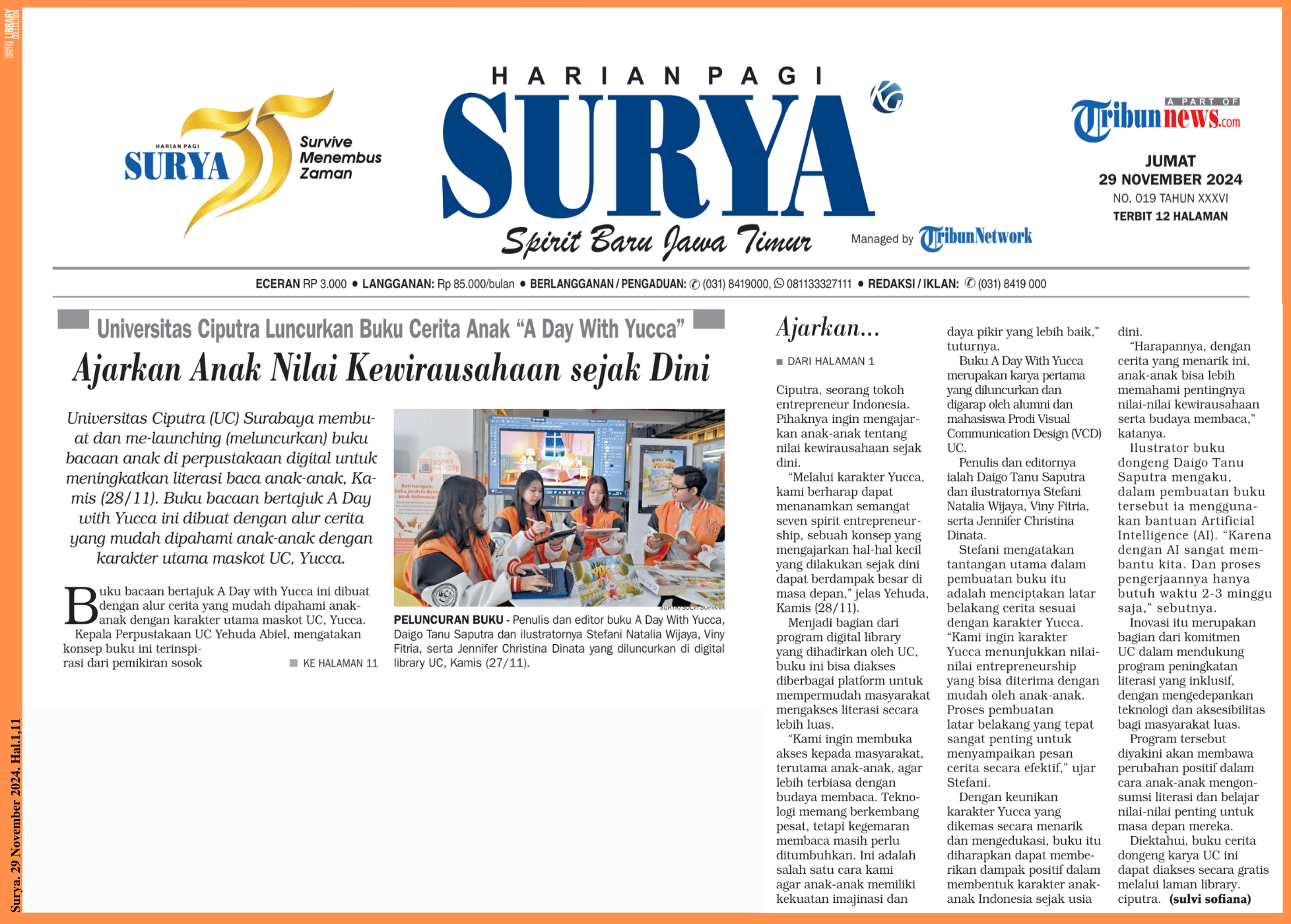 Universitas Ciputra (UC) Surabaya membuat dan melaunching (meluncurkan) buku bacaan anak di perpustakaan digital untuk meningkatkan literasi baca anak-anak, Kamis (28/11). Buku bacaan bertajuk A Day with Yucca ini dibuat dengan alur cerita yang mudah dipahami anak-anak dengan karakter utama maskot UC, Yucca.