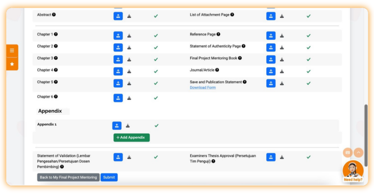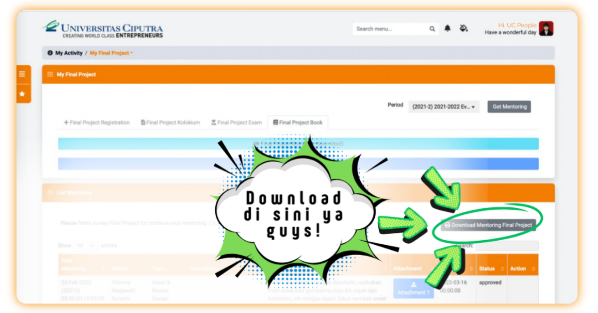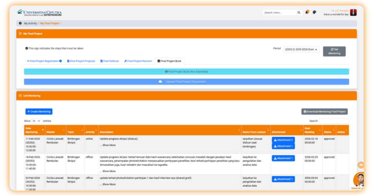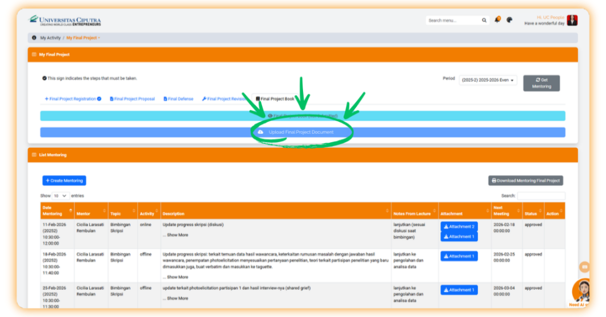 Jika telah diapprove oleh tim dosen, keterangan menu upload pada bagian Final Project Book akan berubah menjadi “Upload Final Project Document”.
