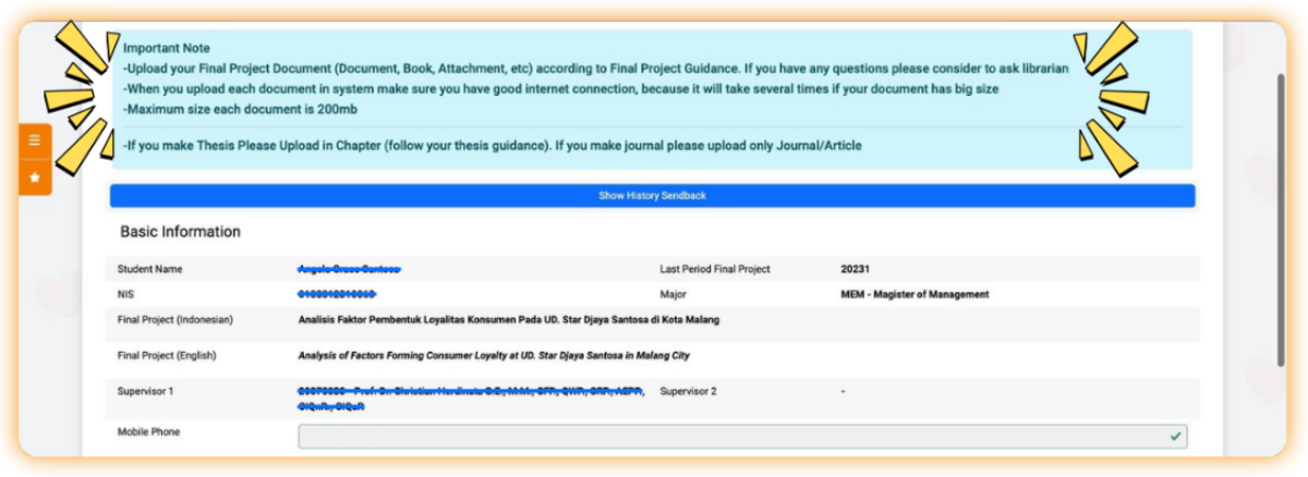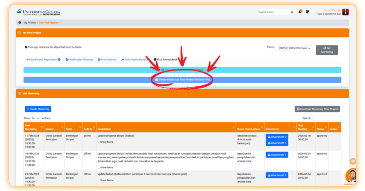 - Pastikan proses pada bagian Final Project Revision telah diapprove oleh tim dosen