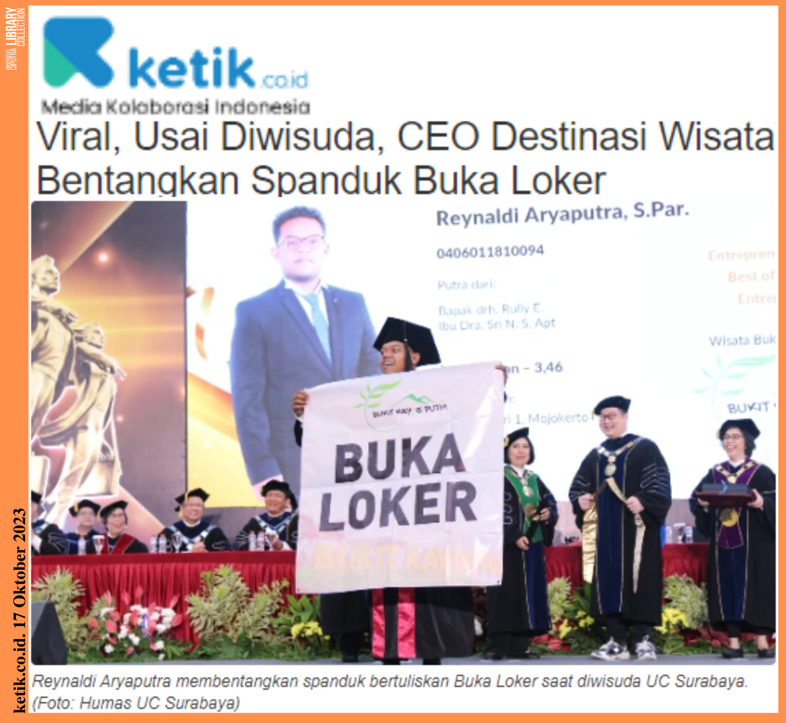 KETIK, SURABAYA – Beberapa waktu lalu viral wisudawan membentangkan spanduk bertuliskan ‘Info Loker’ setelah dirinya diwisuda Universitas Ciputra 2023.