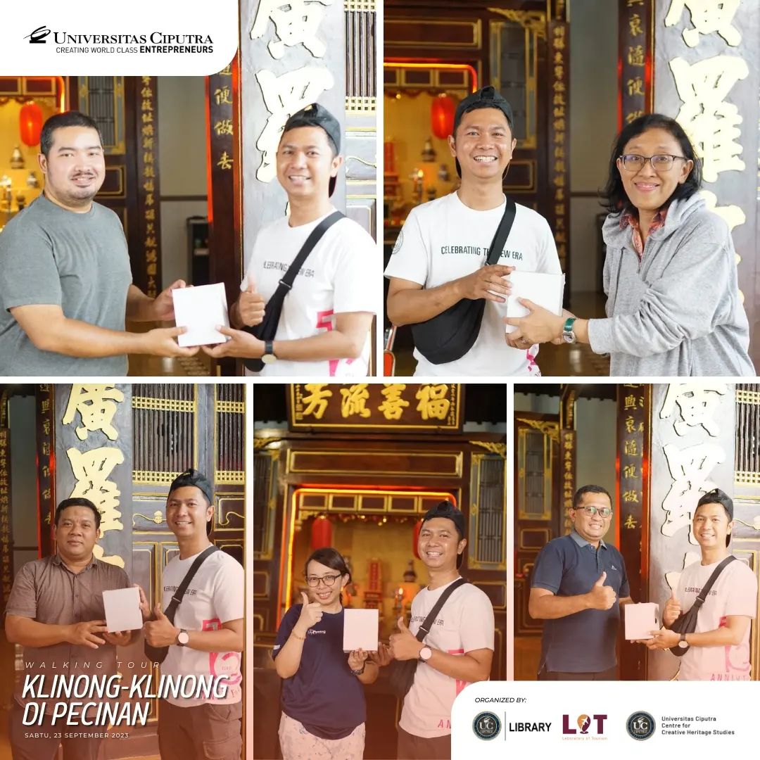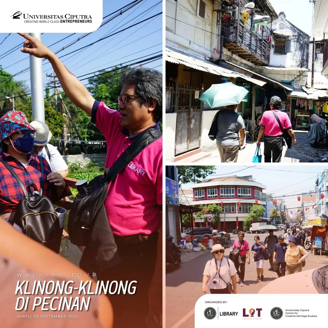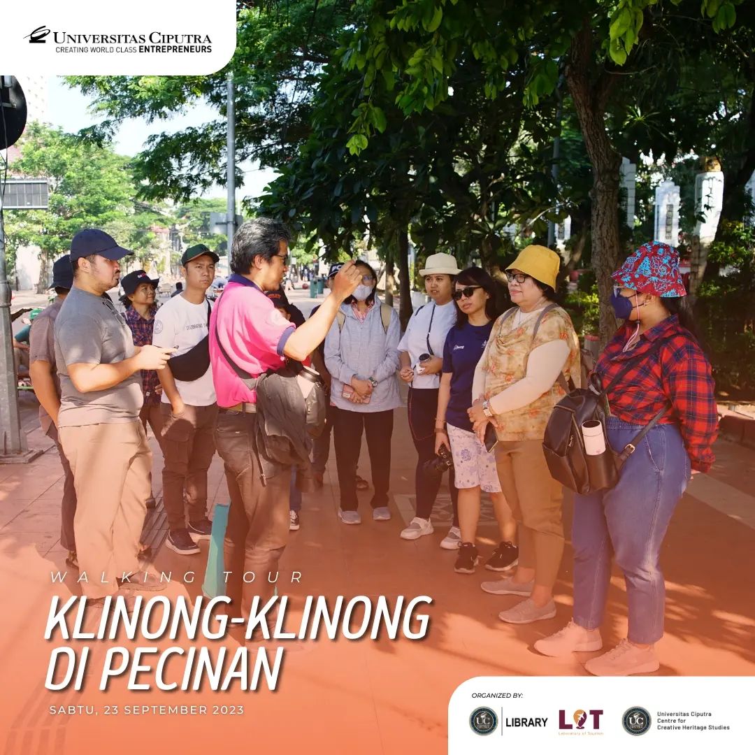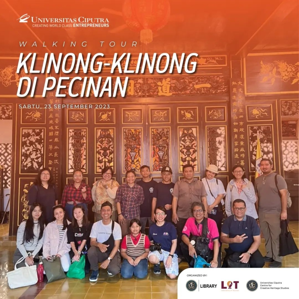 Sabtu, 23 September 2023 lalu, UC library, Laboratory of Tourism Fakultas Pariwisata dan Centre for Creative Heritage Studies bekerja sama dan mengadakan kegiatan menelusur Pecinan Surabaya dengan tajuk Walking Tour: Klinong-klinong di Pecinan. Pada acara ini peserta mendapat trivia dan fakta menarik tentang hidden gem dari lokasi yang dikunjungi bersama dengan Walking Buddy, Bapak Chrisyandi Tri Kartika “Si Payung Merah” (Pustakawan UC) melalui rute yang dilalui: Taman Sejarah, Jalan Karet (Rumah Abu Han), Jalan Coklat (Klenteng Hok An Kiong), Jalan Slompretan (Rumah Perkumpulan Hwie Tiauw Ka), Jalan Songoyudan (Pasar Pabean), Jalan Panggung (belakang pasar Pabean), kembali lagi ke Taman Sejarah. ✨
