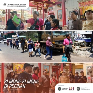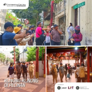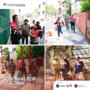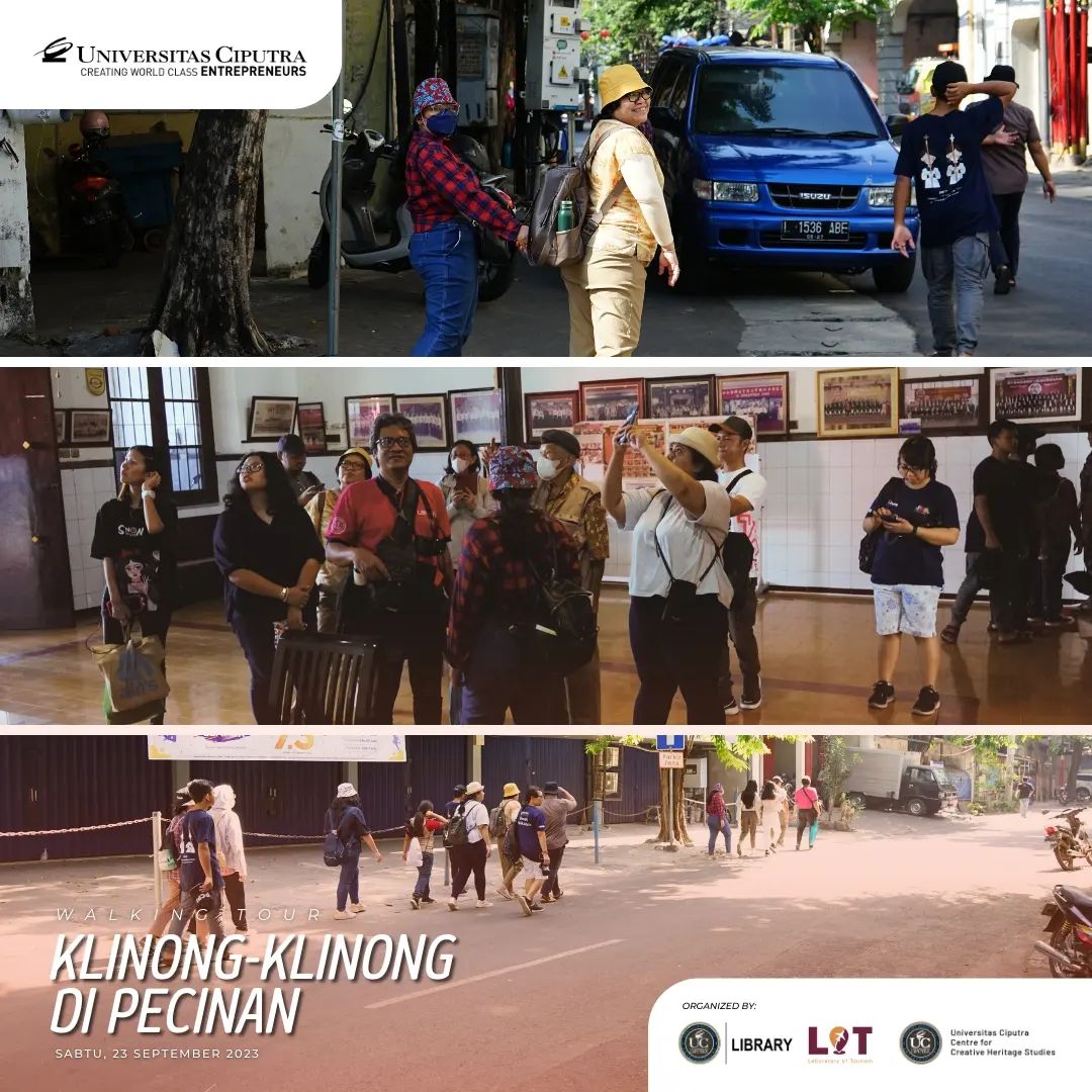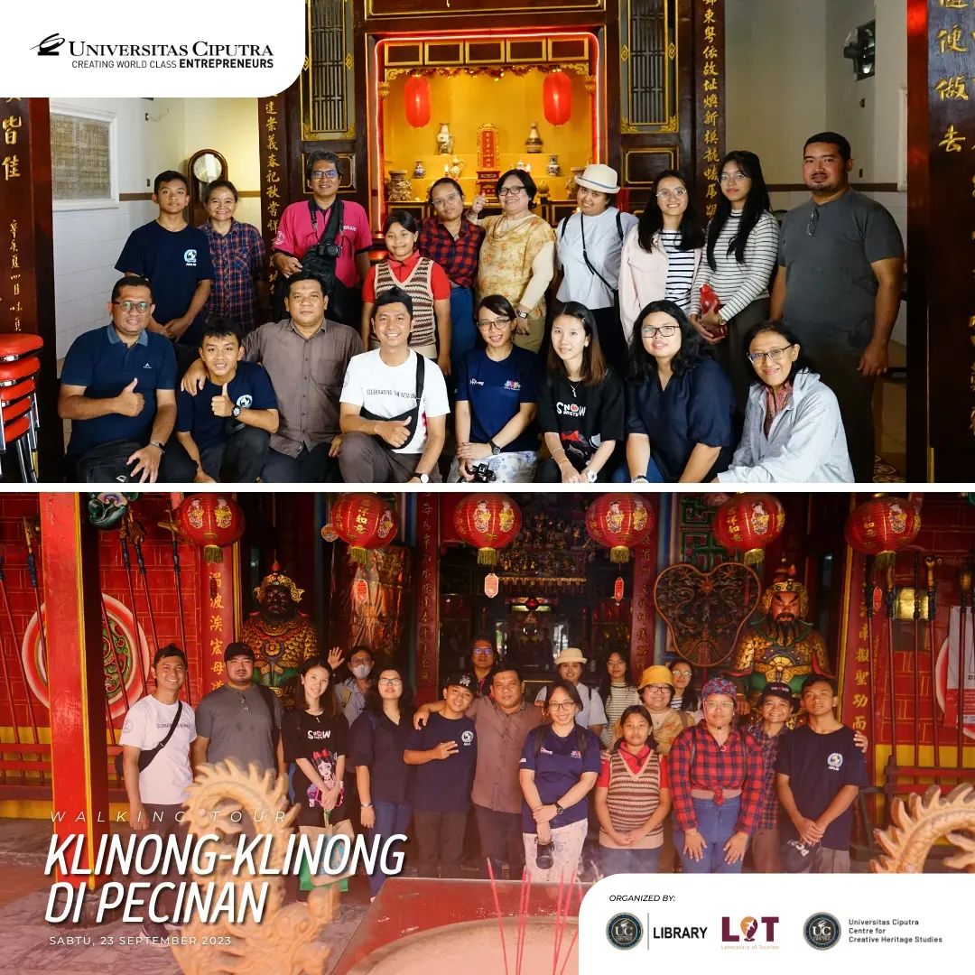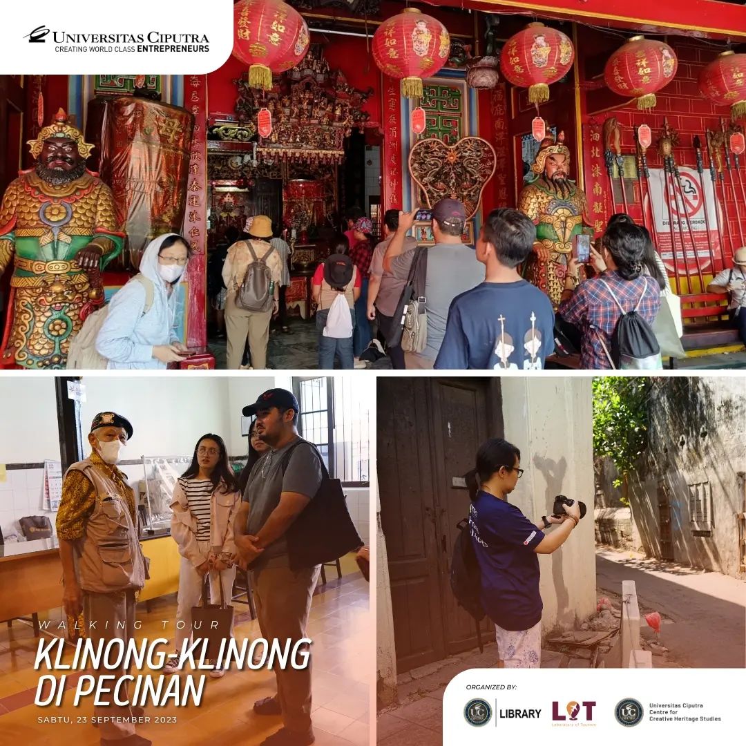 Sabtu, 23 September 2023 lalu, UC library, Laboratory of Tourism Fakultas Pariwisata dan Centre for Creative Heritage Studies bekerja sama dan mengadakan kegiatan menelusur Pecinan Surabaya dengan tajuk Walking Tour: Klinong-klinong di Pecinan. Pada acara ini peserta mendapat trivia dan fakta menarik tentang hidden gem dari lokasi yang dikunjungi bersama dengan Walking Buddy, Bapak Chrisyandi Tri Kartika “Si Payung Merah” (Pustakawan UC) melalui rute yang dilalui: Taman Sejarah, Jalan Karet (Rumah Abu Han), Jalan Coklat (Klenteng Hok An Kiong), Jalan Slompretan (Rumah Perkumpulan Hwie Tiauw Ka), Jalan Songoyudan (Pasar Pabean), Jalan Panggung (belakang pasar Pabean), kembali lagi ke Taman Sejarah. ✨