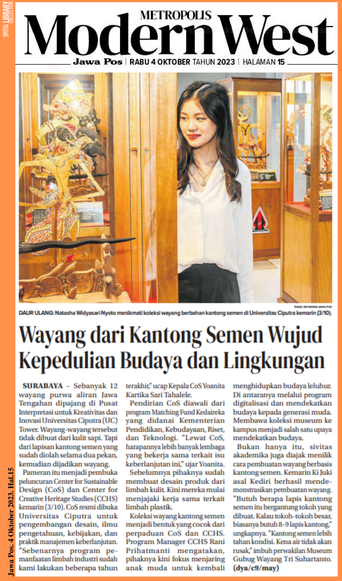 Pameran itu menjadi pembuka peluncuran Center for Sustainable Design (CoS) dan Center for Creative Heritage Studies (CCHS) kemarin(3/10).CoS resmi dibuka Universitas Ciputra untuk pengembangan desain, ilmu pengetahuan, kebijakan, dan praktik manajemen keberlanjutan.