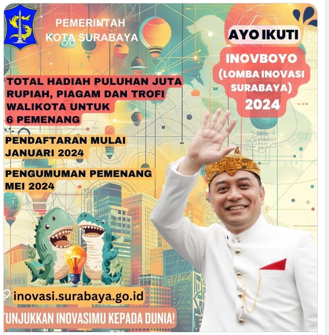 Bersama ini kami sampaikan pengumuman mengenai Lomba Inovasi Surabaya – INOVBOYO 2024 dengan tema “Inovasi Dalam Rangka Peningkatan Potensi Wisata & Perbaikan Lingkungan”. Pemerintah Kota Surabaya memberikan kesempatan bagi seluruh masyarakat umum hingga lembaga pendidikan dan bisnis untuk ikut serta dalam pembangunan yang lebih inovatif di Kota Surabaya.