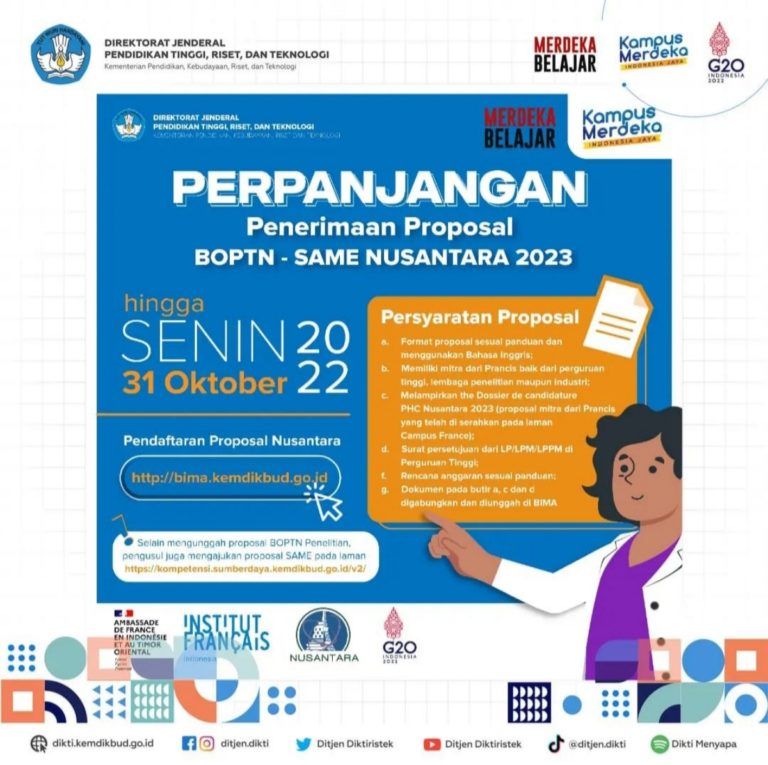 Bersama ini kami sampaikan pengumuman tentang Perpanjangan Penerimaan Proposal Penelitian BOPTN-SAME-PHC NUSANTARA oleh DIKTI berdasarkan nomor surat 1114/E5.4/AL.04/2022. Atas perhatian dan kerja sama Bapak/Ibu kami sampaikan terima kasih.
