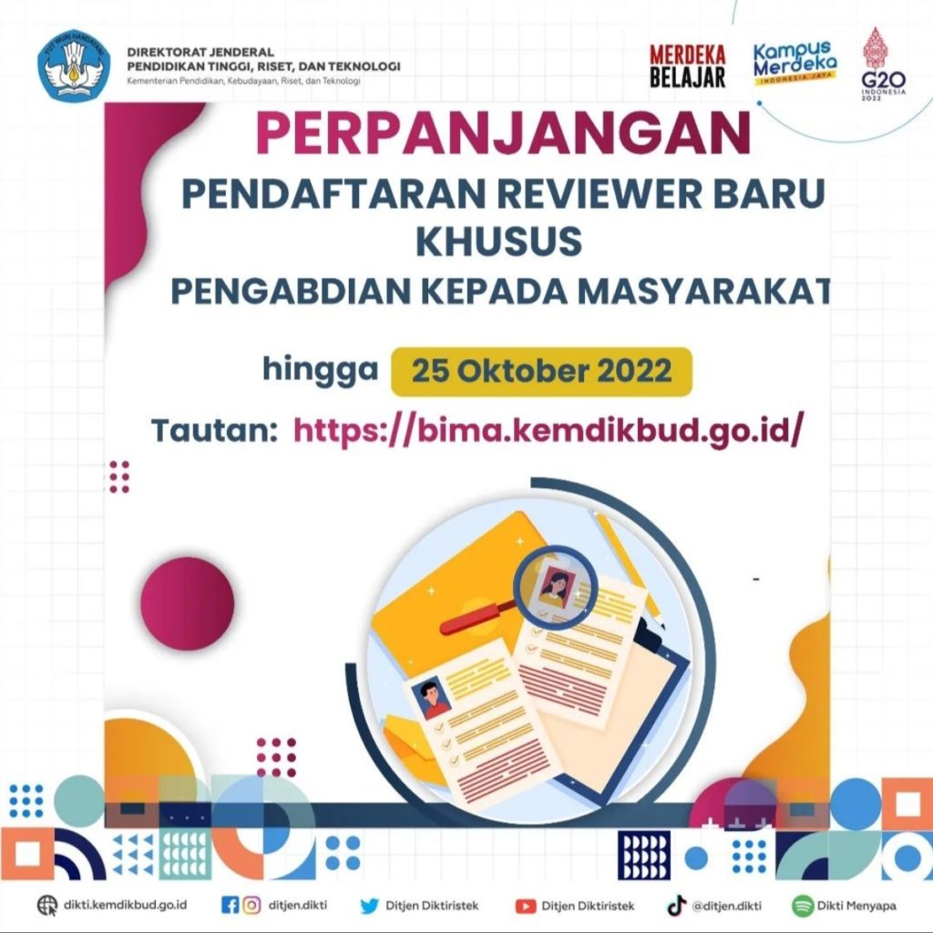 Bersama ini kami sampaikan pengumuman tentang Pengumuman Perpanjangan Pendaftaran Calon Reviewer Pengabdian kepada Masyarakat berdasarkan nomor surat 1123/E5.5/AL.04/2022. Pendaftaran calon reviewer baru pengabdian kepada masyarakat dilakukan melalui platform https://bima.kemdikbud.go.id/ paling lambat tanggal 25 Oktober 2022 pukul 23.59 WIB. Atas perhatian dan kerja sama Bapak/Ibu kami sampaikan terima kasih.