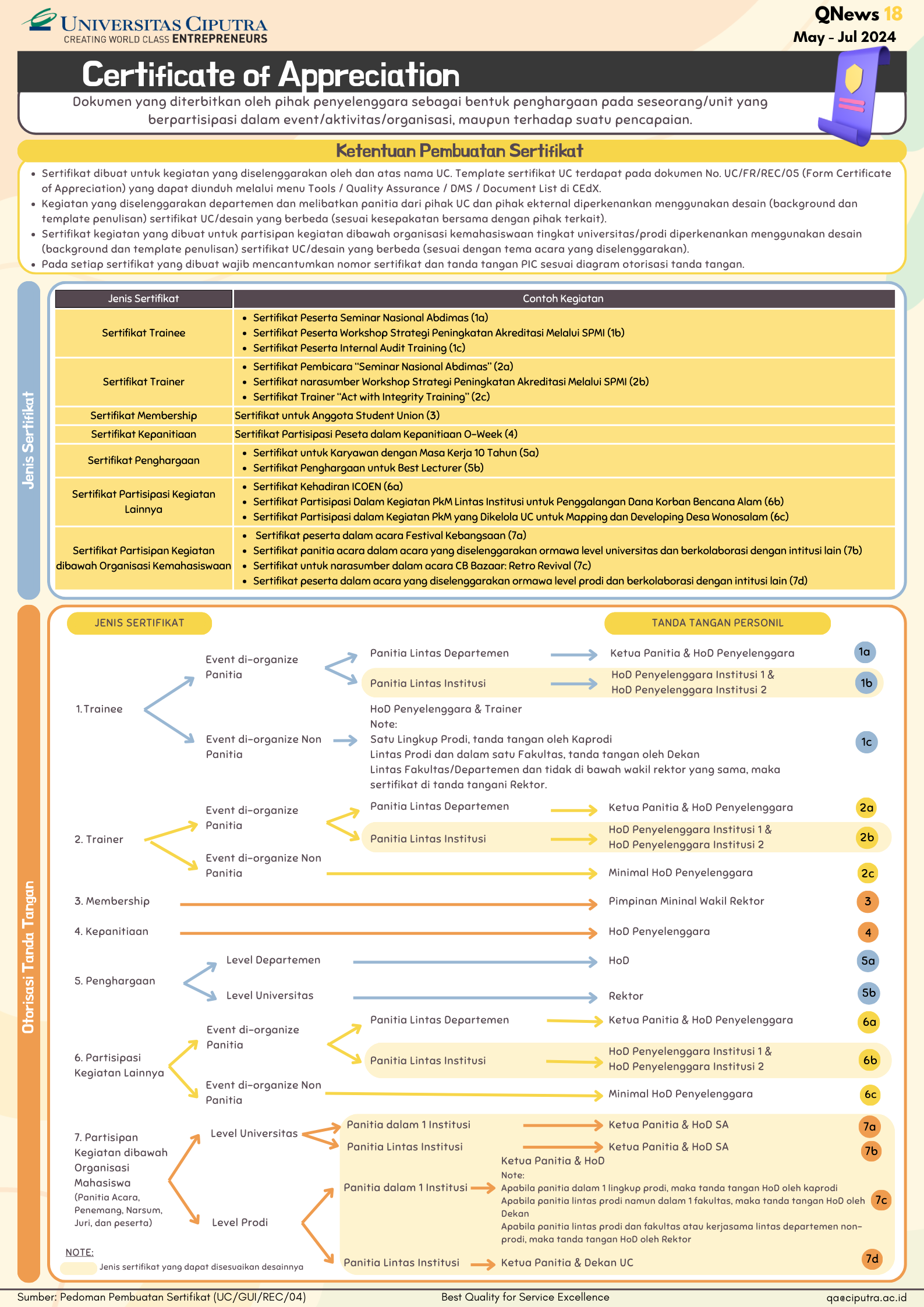 Dalam pembuatan sertifikat terdapat komponen yang perlu diperhatikan mulai dari penggunaan desain (background dan format penulisan), penomoran sertifikat, penulisan gelar, otorisasi tanda tangan sertifikat, dan peletakan stempel institusi. Di Universitas Ciputra telah disediakan template untuk penulisan sertifikat yang dapat diakses pada aplikasi Document Management System (DMS) dengan judul dokumen Form Certificate of Appreciation (UC/FR/REC/05) didalamnya terdiri atas template format penulisan untuk jenis sertifikat 1a hingga 7d. Terdapat catatan dalam penggunaan desain (background dan format penulisan) yaitu apabila kegiatan diselenggarakan departemen dan melibatkan panitia dari pihak UC dan pihak eksternal diperkenankan menggunakan desain yang berbeda dari template UC. Hal ini pun berlaku apabila sertifikat kegiatan dibuat untuk partisipan kegiatan dibawah organisasi kemahasiswaan baik tingkat universitas/prodi.