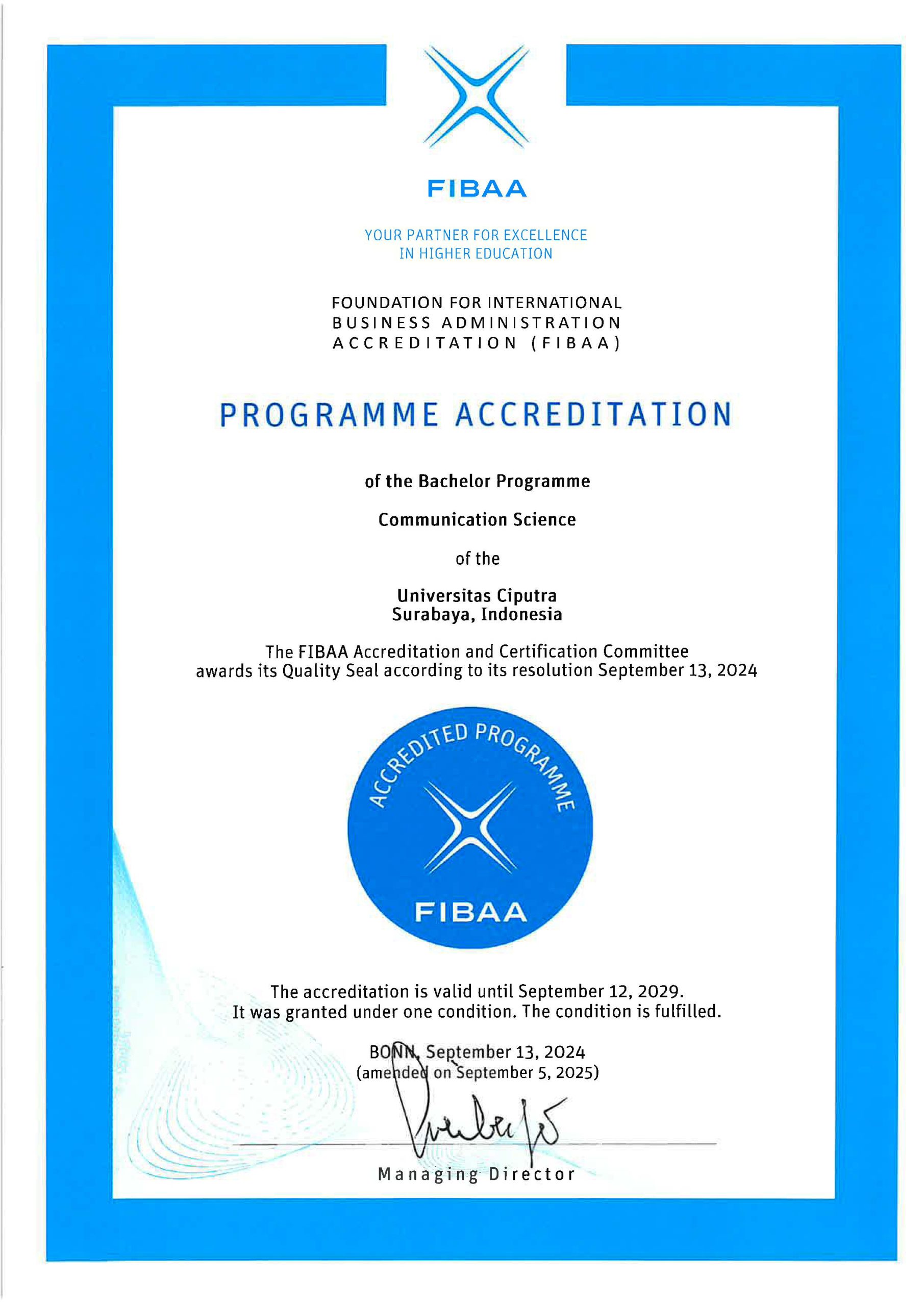 Accreditation Certificate FIBAA Bachelor of Communication Science 2024