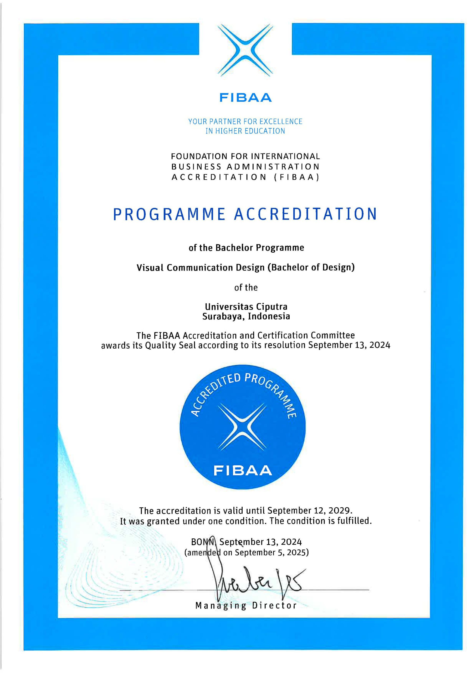 Accreditation Certificate FIBAA Bachelor of Visual Communication Design 2024