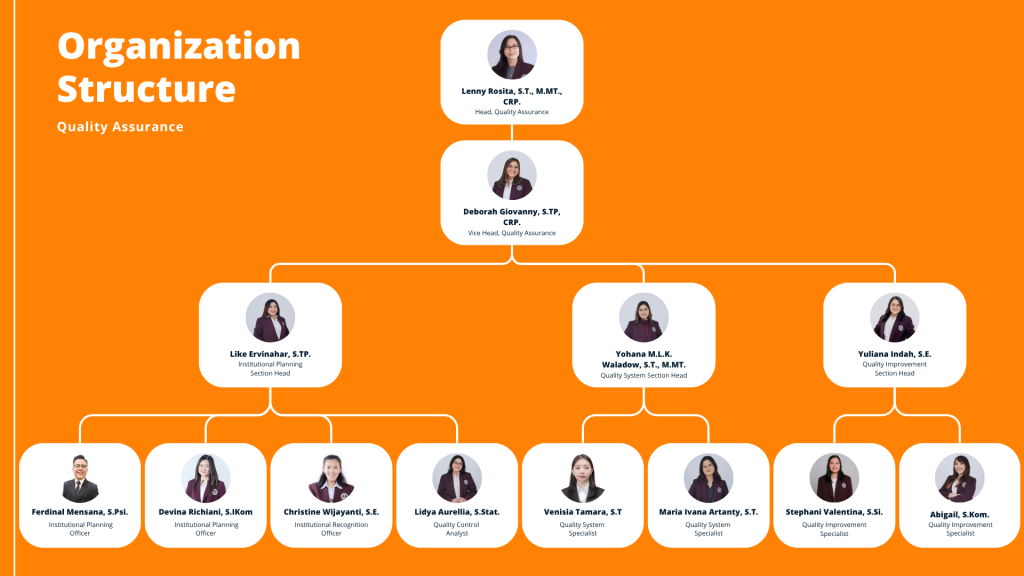 Departemen Quality Assurance tingkat universitas terdiri dari 8 personil yang dikepalai oleh Head dan Vice Head. Pertanggungjawaban seorang Quality Improvement Specialist kepada Quality Improvement Section Head, lalu Vice Head, Quality Assurance. Berbeda dengan seorang Quality System Specialist dan Quality Control Analyst yang pertanggungjawabannya langsung pada Vice Head, Quality Assurance