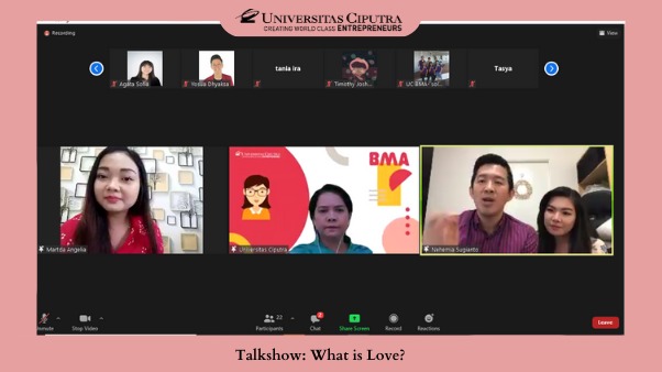 Valentine Day 14 Februari 2021 menjadi hari kasih sayang yang sangat unik sepanjang sejarah. Karena adanya pandemic, namun hal ini tidak menyurutkan semangat generasi muda untuk turut serta meramaikan hari Valentine ini dengan mengikuti seminar special edition yang diselenggarakan oleh BMA Universitas Ciputra dengan Tema What Is Love?. Seminar ini dilaksanakan dalam bentuk online via Zoom meeting. Tidak hanya itu, beberapa narasumber yang kompeten dibidangnya juga ikut meramaikan acara ini diantaranya yaitu Ida Kristin Sianipar, S.Th.,M.M. selaku Kepala BMA Universitas Ciputra dan pasangan muda yang luar biasa Nehemia Sugianto, ST., M.MT. dan Elizabeth Irene Yuwono, S.Kom.,MBus. Seminar ini dihadiri oleh beberapa participant yang sangat antusias dalam mengikuti seminar ini. Sebagian dari mereka hadir bersama pasangan. Sehingga mereka dapat belajar bersam secara langsung mengenai Cinta yang benar. Hal ini dibuktikan dengan adanya banyak pertanyaan yang sangat natural dan berkaitan dengan apa yang sering dialami oleh kebanyakan pasangan muda saat ini. Oleh karena itu Seminar ini justru terlihat lebih seru dan menyenangkan karena banyaknya diskusi dan sharing yang terjadi. Tidak sedikit pula dari mereka yang single juga ikut meraimakan acara ini untuk dapat menimba ilmu yang tepat untuk masa yang akan mungkin mereka lalui nantinya. Sehingga bahasan tentang cinta dalam seminar ini beragam tidak hanya cinta untuk pasangan namun juga untuk sesama seperti sahabat, orang tua, saudara, dan lain-lain. Acara ini juga dilengkapi dengan adanya aktivitas menarik seperti ice breaking mengenai pertanyaan seputar cinta namun dengan jawaban yang abu-abu atau ambigu. Sehingga dapat terlihat sejauh mana generasi muda saat ini dalam memahami dan memaknai cinta yang sebenarnya. Hingga pada penghujung acara Seminar What Is Love? ini kembali dapat dilihat melalui testimoni yang diberikan oleh beberapa participant mulai adanya perkembangan yang baik dibandingkan pada saat mereka datang khususnya mengenai cinta dan relationship. Banyak cerita juga banyak ilmu yang didapat dari seminar ini “Cinta yang benar adalah cinta yang Walaupun, bukan Cinta yang Jikalau” ujar Ida Kristin Sianipar selaku pembicara. “Jika kamu salah makan maka efeknya kamu akan tanggung dalam 1 hari karena sakit perut. Jika kamu salah potong rambut maka efeknya kamu akan tanggung 1 tahun. Tetapi Jika kamu salah pilih pasangan hidup efeknya kamu tanggung Seumur hidup” Ujar Nehemia Sugianto. Beberapa kata tersebut merupakan kata-kata yang menjadi favorite untuk dicatat sebagai salah satu pedoman yang tepat untuk menghadapi tantangan dalam hubungan pacaran. (MAV)