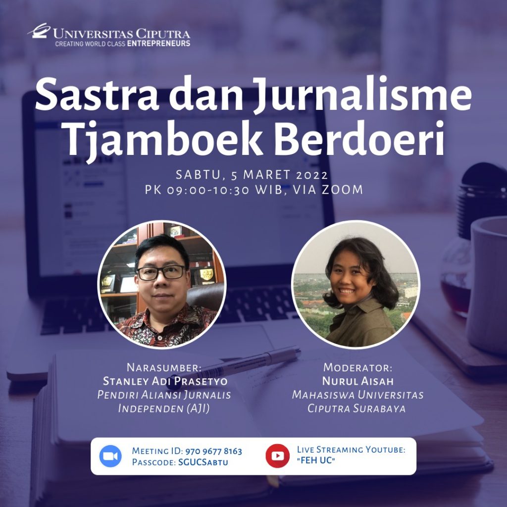 Fakultas Entrepreneur dan Humaniora Universitas Ciputra (FEH UC) mengadakan sebuah kuliah umum dengan tema “Sastra dan Jurnalisme Tjamboek Berdoeri”. Acara ini diadakan pada Sabtu (5/3) dan dibawakan oleh Stanley Adi Prasetyo, pendiri Aliansi Jurnalistik Independen (AJI).