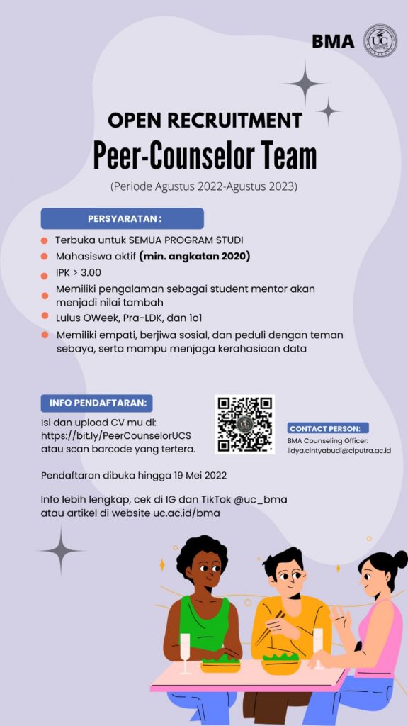 Untuk syarat-syarat dan cara mendaftar di tim Peer Counselor BMA sudah tertera di barcode yang bisa di scan pada poster maupun di link berikut ini: bit.ly/PeerCounselorUCS