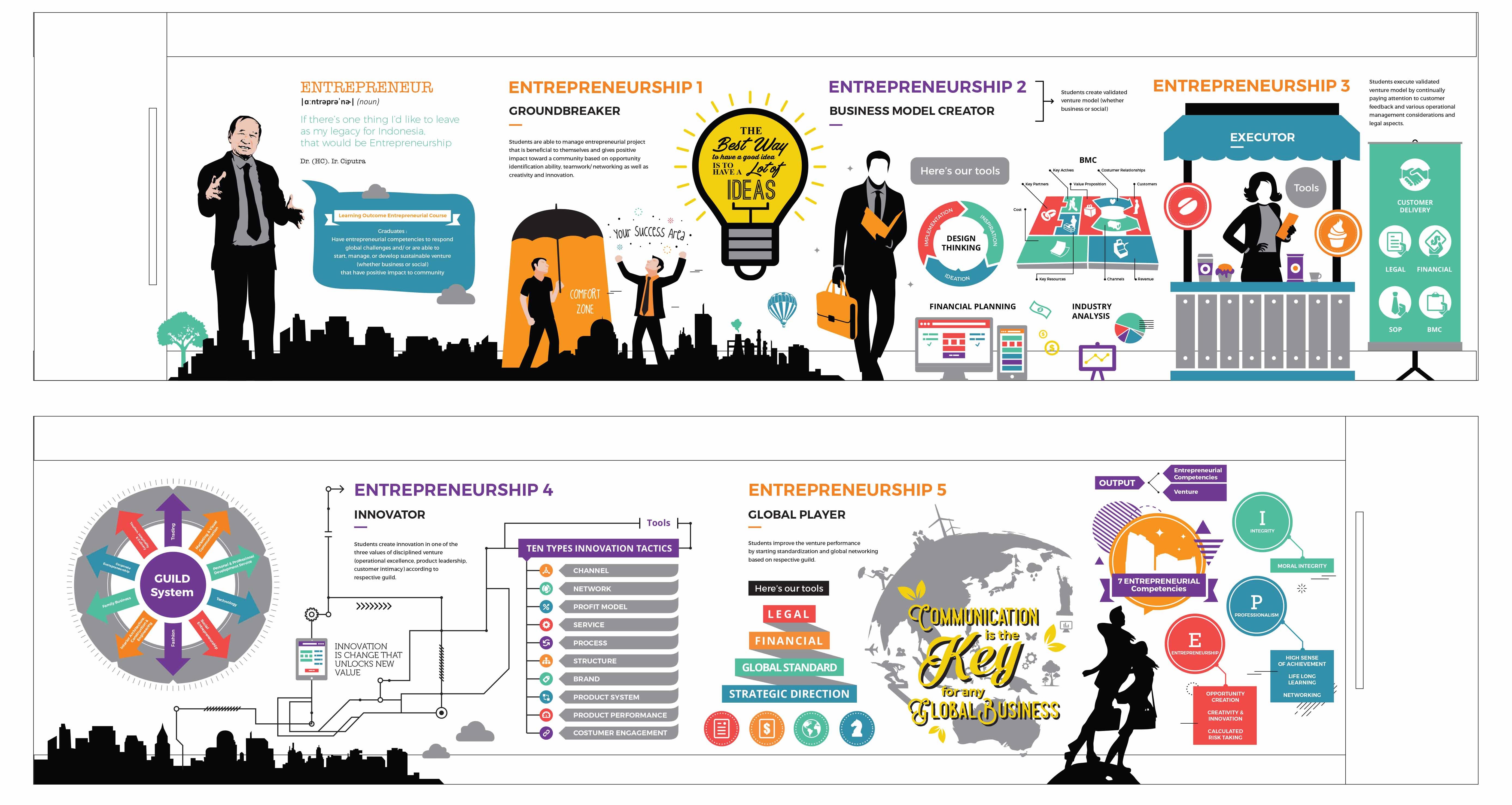 Selama 4 tahun, pengajaran kurikulum setiap jurusan dikemas dengan Entrepreneurial Spirit sehingga menjadikannya sebuah sistem belajar mengajar yang unik dan mampu meningkatkan keahlian serta kemampuan soft skill mahasiswa pada waktu yang bersamaan.
