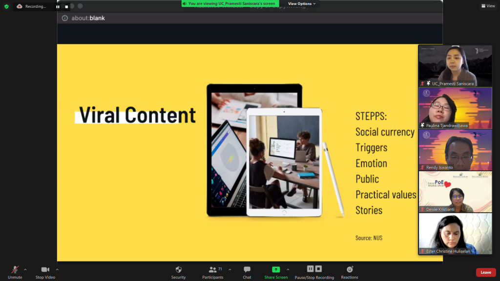 Pada tanggal 6 Agustus 2021 3 dosen VCD UC diundang untuk mengisi acara Teacher Profesional Development yang diselenggarakan oleh Sekolah Citra Berkat. Untuk sesi pada kali ini dosen VCD yg terlibat adalah Ibu Paulina, Ibu Cara, dan Bpk Rendy yang membawakan materi tentang Copy Writing & Viral Content, guna membekali pengetahuan baru tentang media sosial kepada para guru guru Sekolah Citra Berkat agar materi tersebut bisa membantu para guru Sekolah Citra Berkat untuk mementoring bisnis dari para siswanya