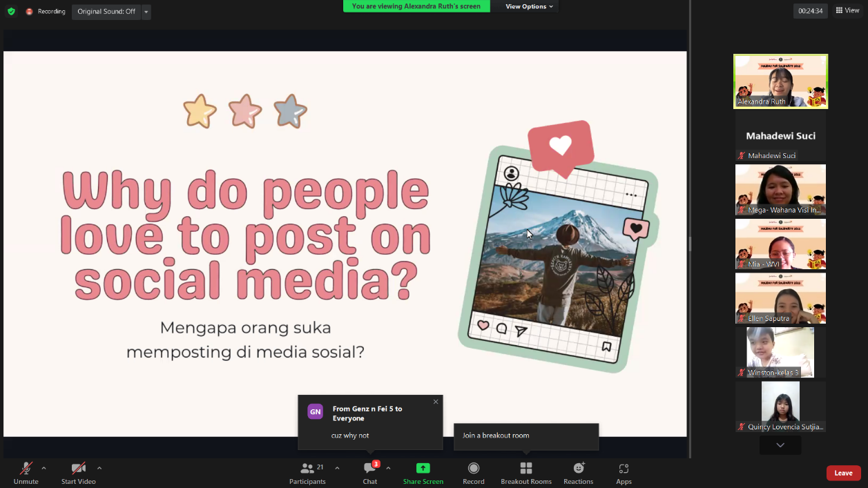 Pada akhir acara, diadakan kuis melalui quizziz untuk mengevaluasi hal hal yang para pelajar telah dapatkan dalam materi Digital Campaign. Diharapkan materi yang diberikan dapat memberikan informasi dan ilmu pengetahuan serta pengalaman yang berkesan bagi peserta Holiday For Solidarity.