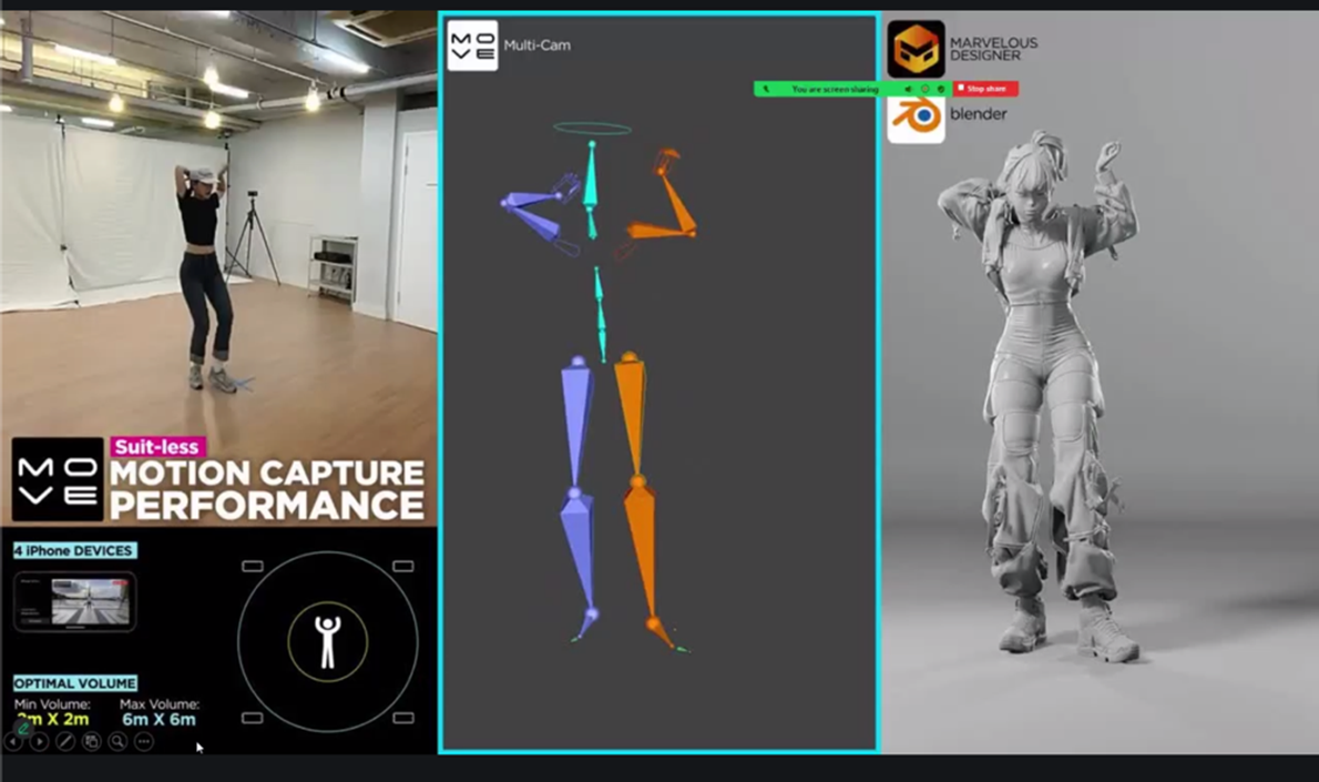 Selain itu, metode yang lebih hemat biaya juga tersedia, seperti motion capture menggunakan platform Move Multicam. Teknologi ini mengandalkan rigging dan perangkat lunak seperti Marvelous Designer untuk merancang pakaian digital, sebelum akhirnya dianimasikan menggunakan Blender.
