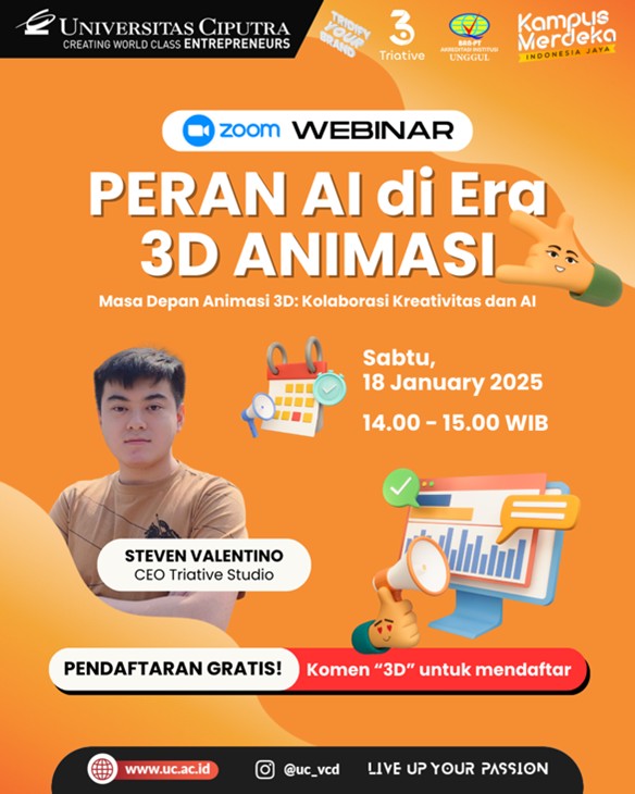 Pada 18 Januari 2025, sebuah webinar bertajuk “Peran AI dalam 3D Animasi” diadakan dengan Steven Valentino sebagai pembicara utama. Sebagai CEO Triative Studio, Steven membagikan wawasan kepada 25 peserta tentang bagaimana AI berperan dalam pengembangan animasi 3D. Triative Studio dikenal sebagai penyedia layanan animasi dan model 3D dengan pengalaman luas dalam bekerja sama dengan berbagai merek ternama. Dalam sesi ini, ia menjelaskan bagaimana AI membantu dalam tahap ideasi, pembuatan storyboard, pengambilan gambar, dan berbagai aspek produksi lainnya.