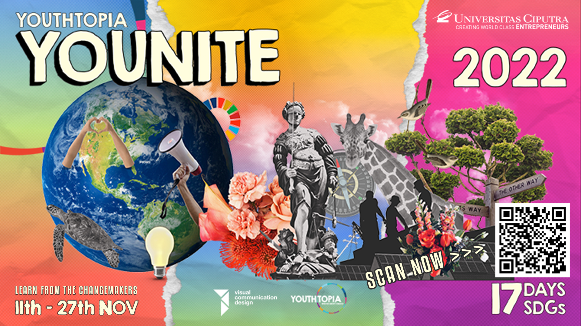 YOUNITE adalah acara tahunan terbesar dari YOUTHTOPIA yang biasanya diadakan bertepatan dengan United Nations Climate Change Conference. Acara YOUNITE tahun ini diadakan pada 11 – 27 November 2022 secara online yang dihadiri oleh banyak agen perubahan dari seluruh dunia. Selama 17 hari, kami akan menyajikan sesi-sesi diskusi mengenai 17 Tujuan Pembangunan Berkelanjutan dari PBB bersama dengan anak-anak muda yang memiliki proyek di garda terdepan. Kami akan membahas mengenai isu-isu yang berkaitan dan yang ditemukan di lapangan dan solusi untuk menanggulangi isu-isu tersebut. Unsur paling menarik dari acara ini adalah kami memberikan wadah bagi anak-anak muda untuk bisa belajar dan bertukar pikiran.